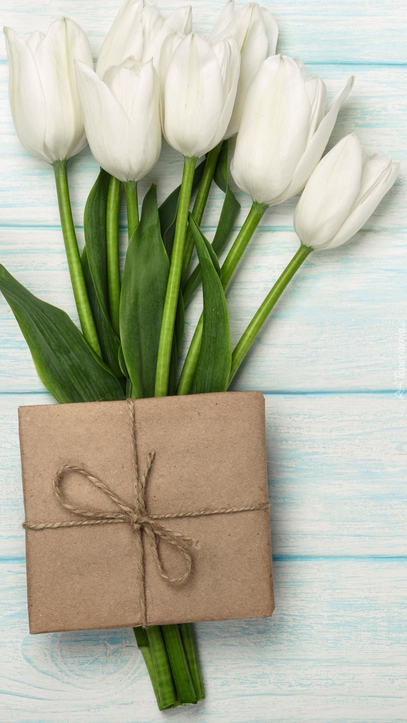 Edytor tapety: Prezent na białych tulipanach