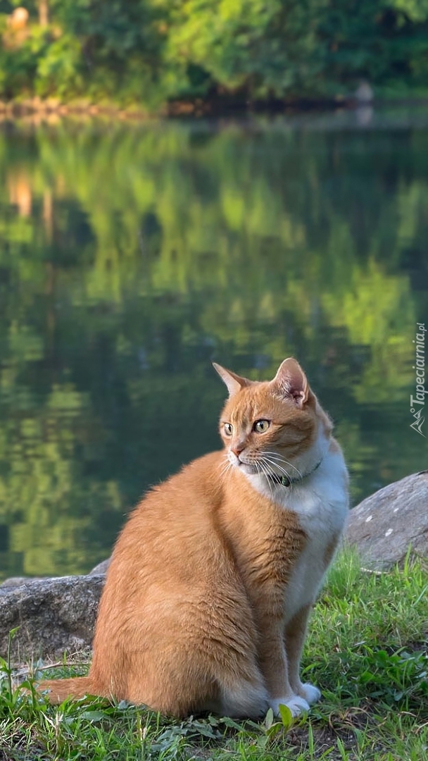 Edytor tapety: Rudo-biały kot nad stawem