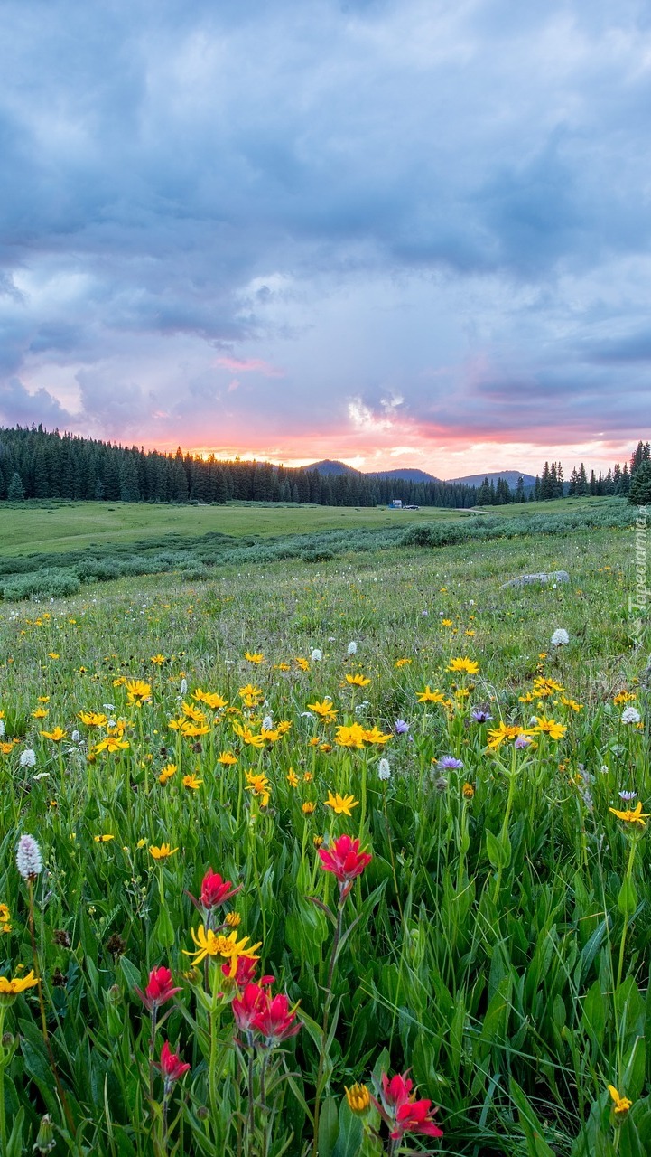 Edytor tapety: Chmury nad ukwieconą łąką