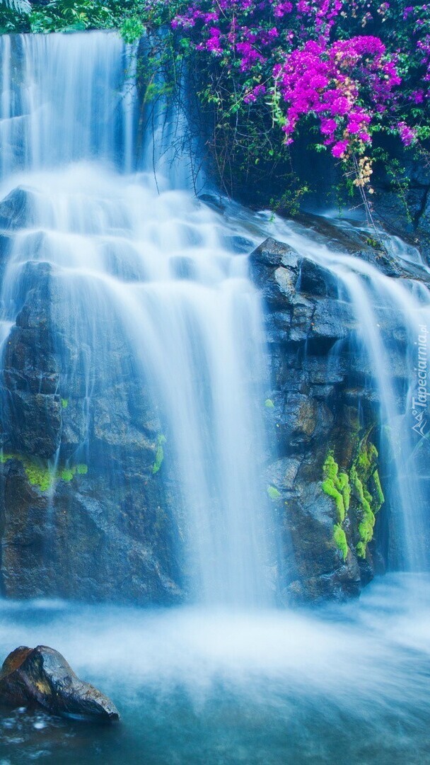 Edytor tapety: Kwiaty przy skalnym wodospadzie