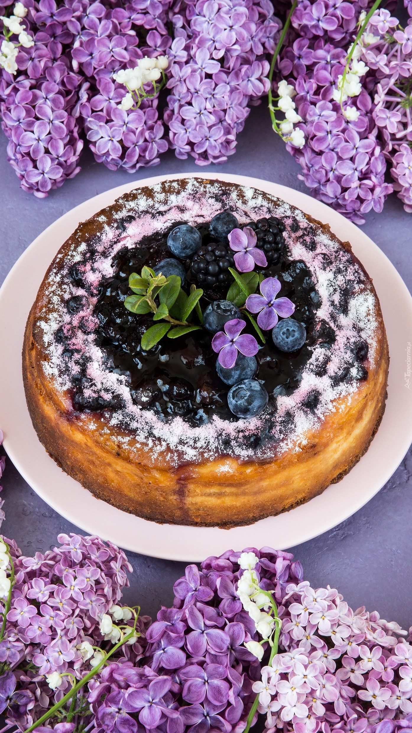 Edytor tapety: Ciasto z jagodami pośród bzu