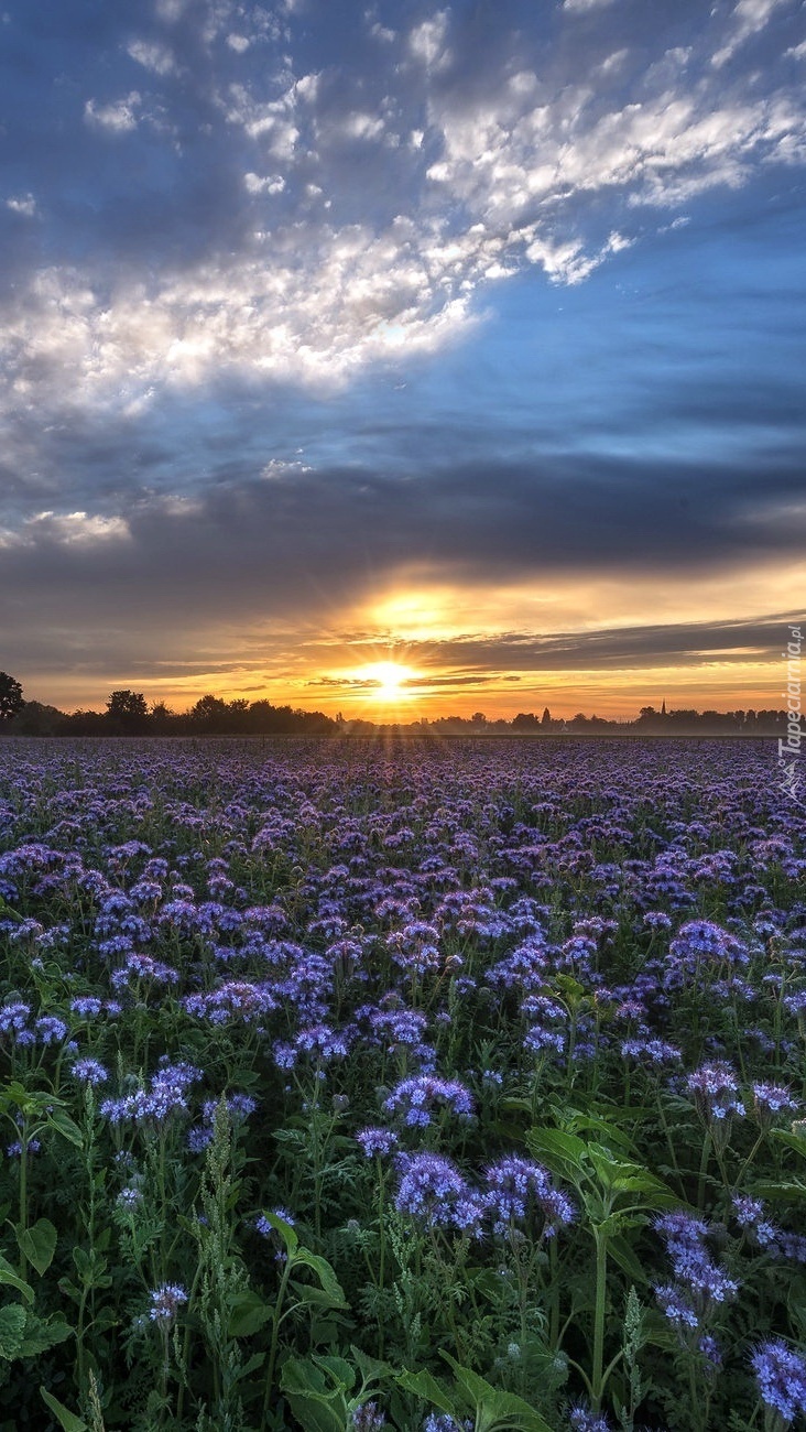 Edytor tapety: Zachód słońca nad łąką niebieskich kwiatów