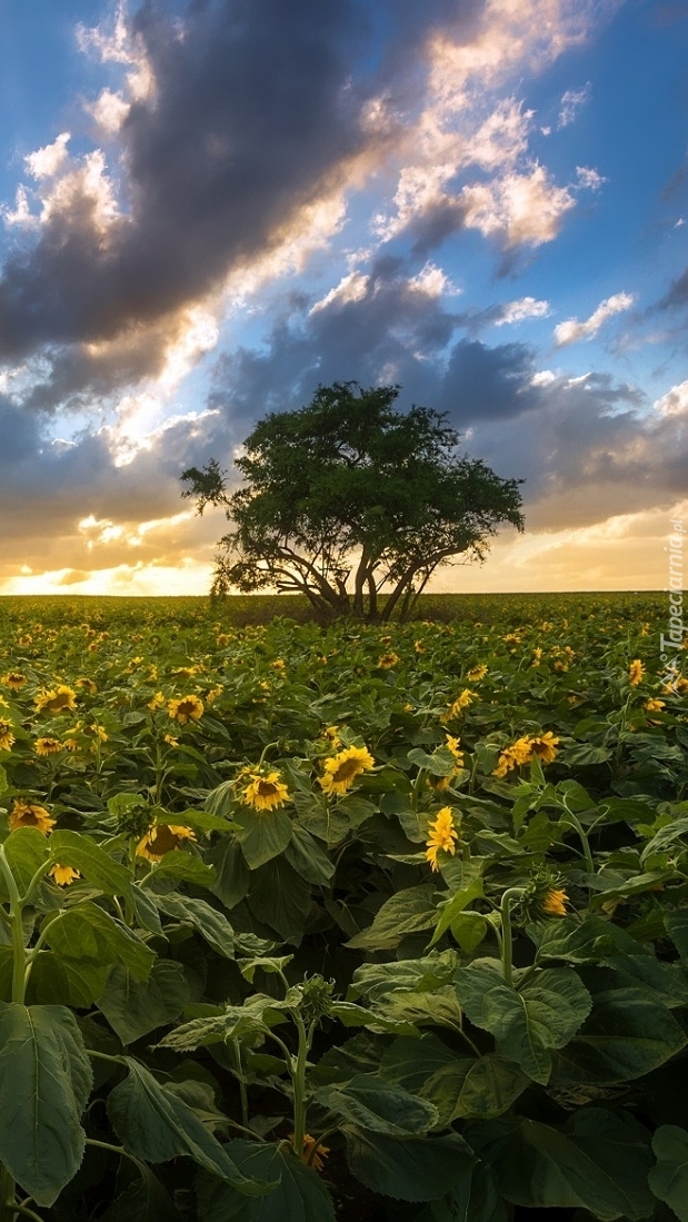 Edytor tapety: Chmury nad drzewem na polu słoneczników