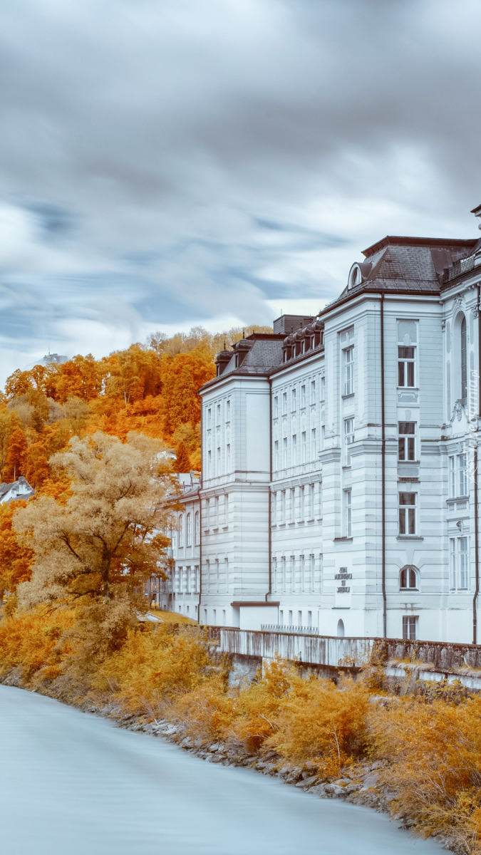 Edytor tapety: Domy i jesienne drzewa nad kanałem