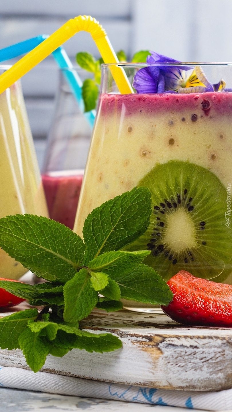 Edytor tapety: Szklanka z koktajlem owocowym na desce