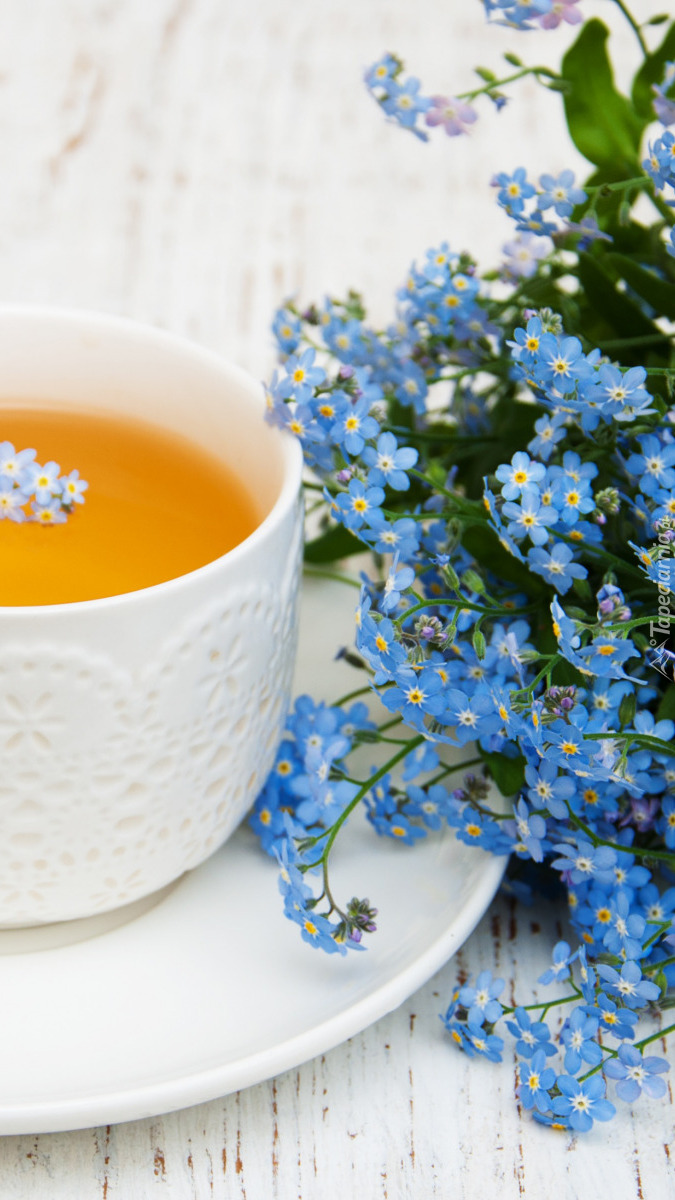 Edytor tapety: Niezapominajki obok filiżanki z herbatą