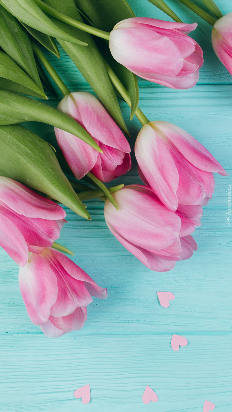 Edytor tapety: Różowe tulipany i rozsypane serduszka