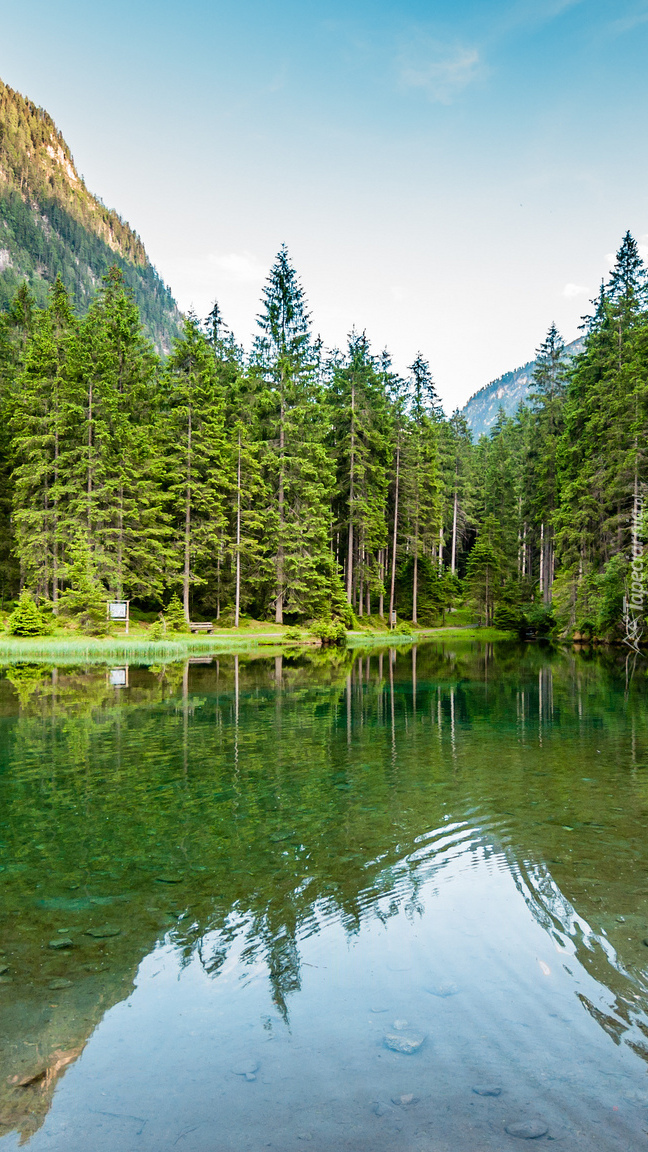Edytor tapety: Zalesiony brzeg górskiego jeziora