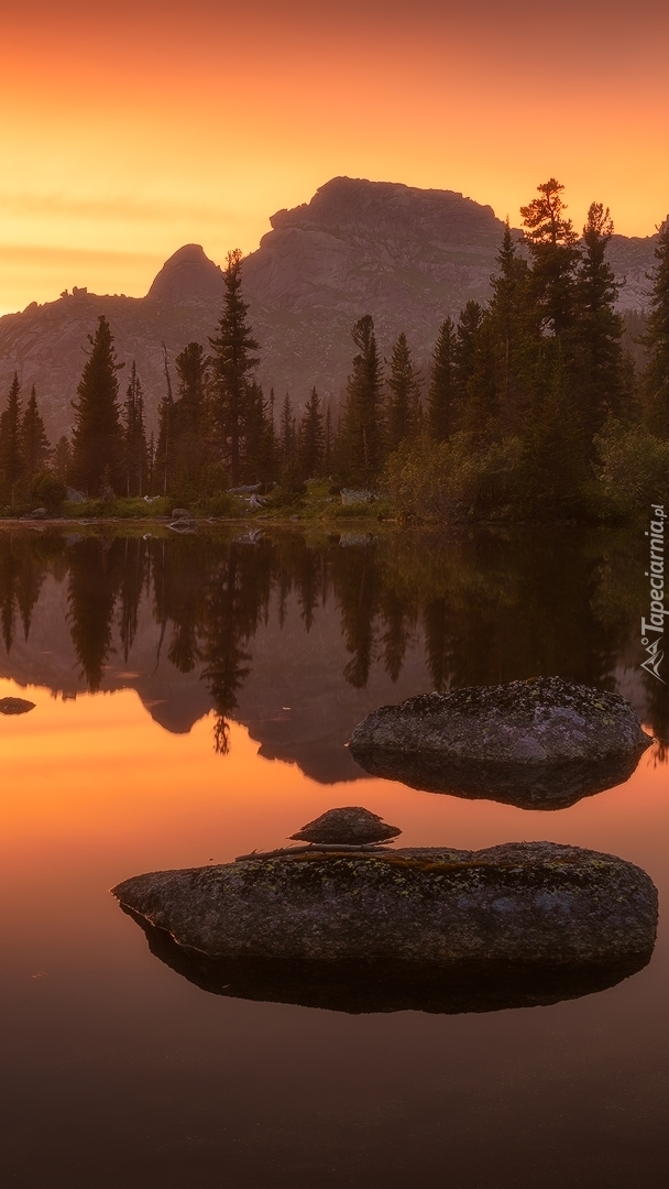 Edytor tapety: Jezioro w górach o zachodzie słońca