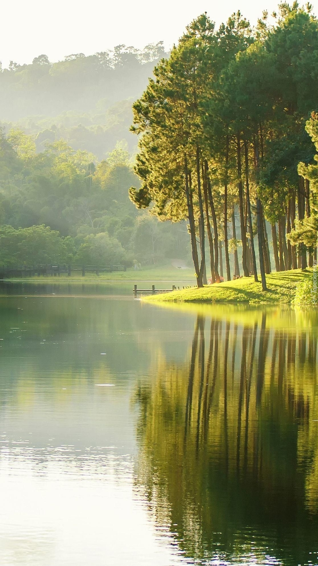 Edytor tapety: Drzewa nad jeziorem o poranku