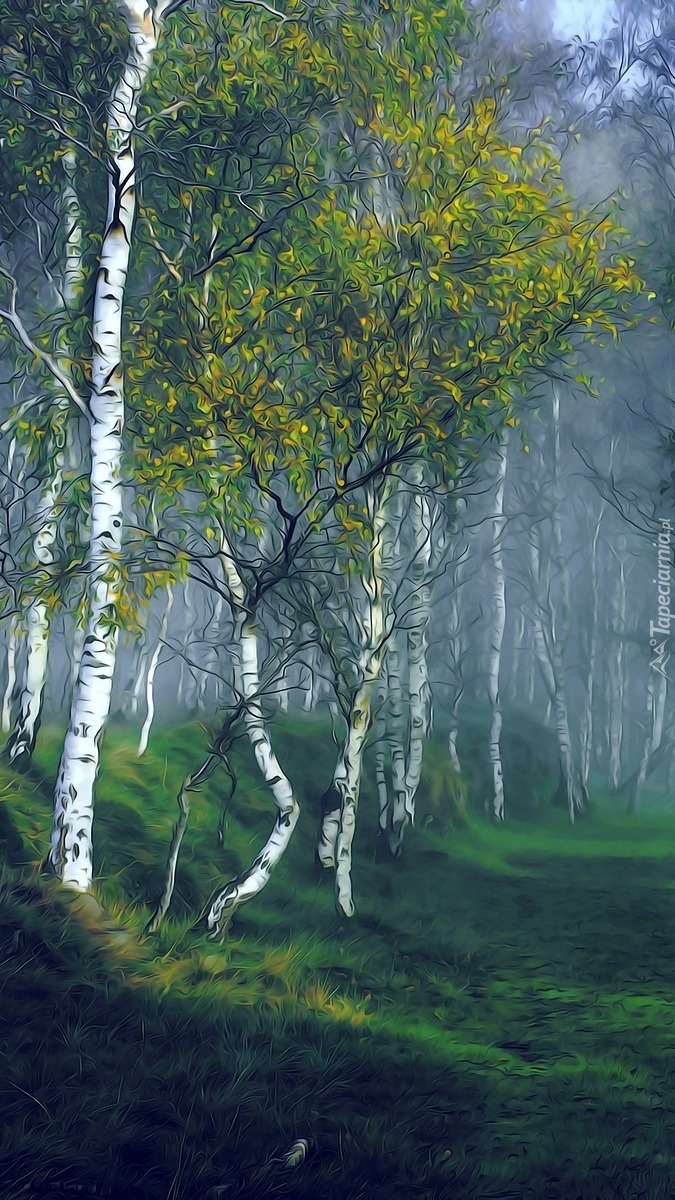 Edytor tapety: Grafika zamglonego brzozowego lasu