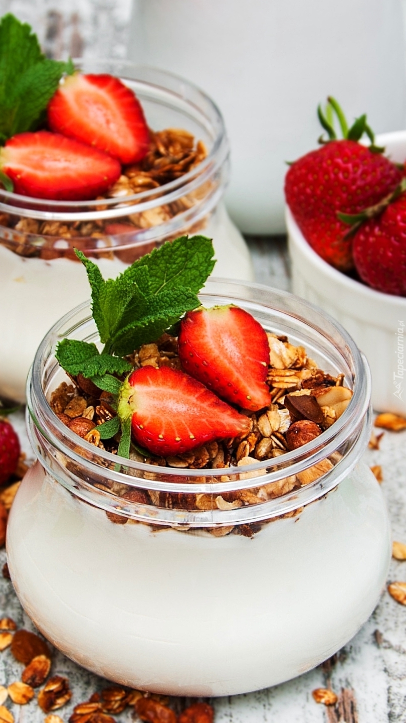 Edytor tapety: Słoiczki jogurtu z musli i truskawkami