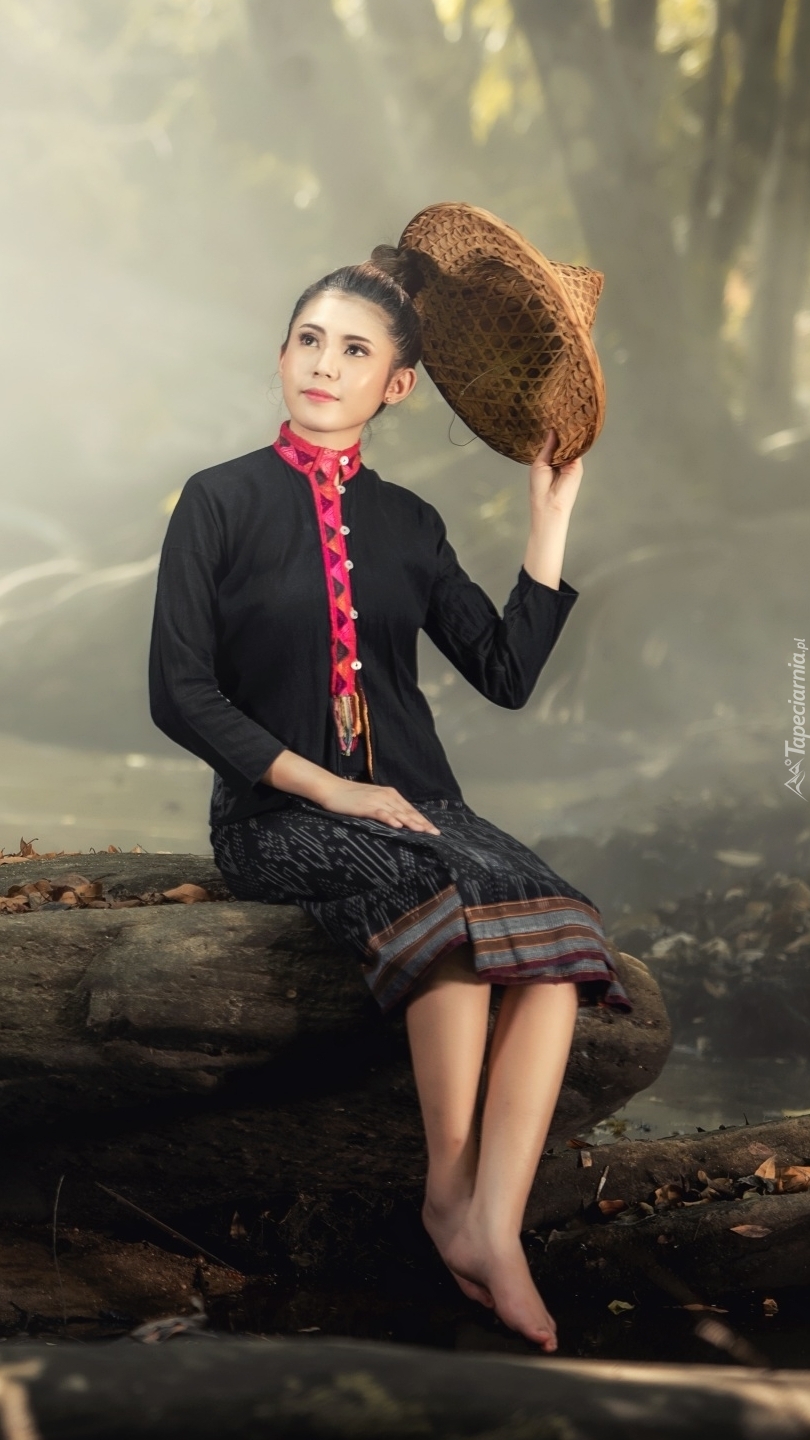 Edytor tapety: Azjatka z kapeluszem w ręce