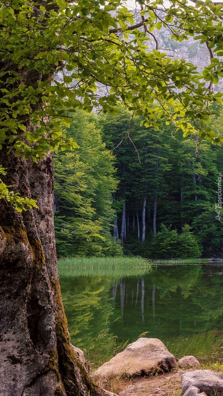 Edytor tapety: Kamienie obok drzewa przy leśnym jeziorze