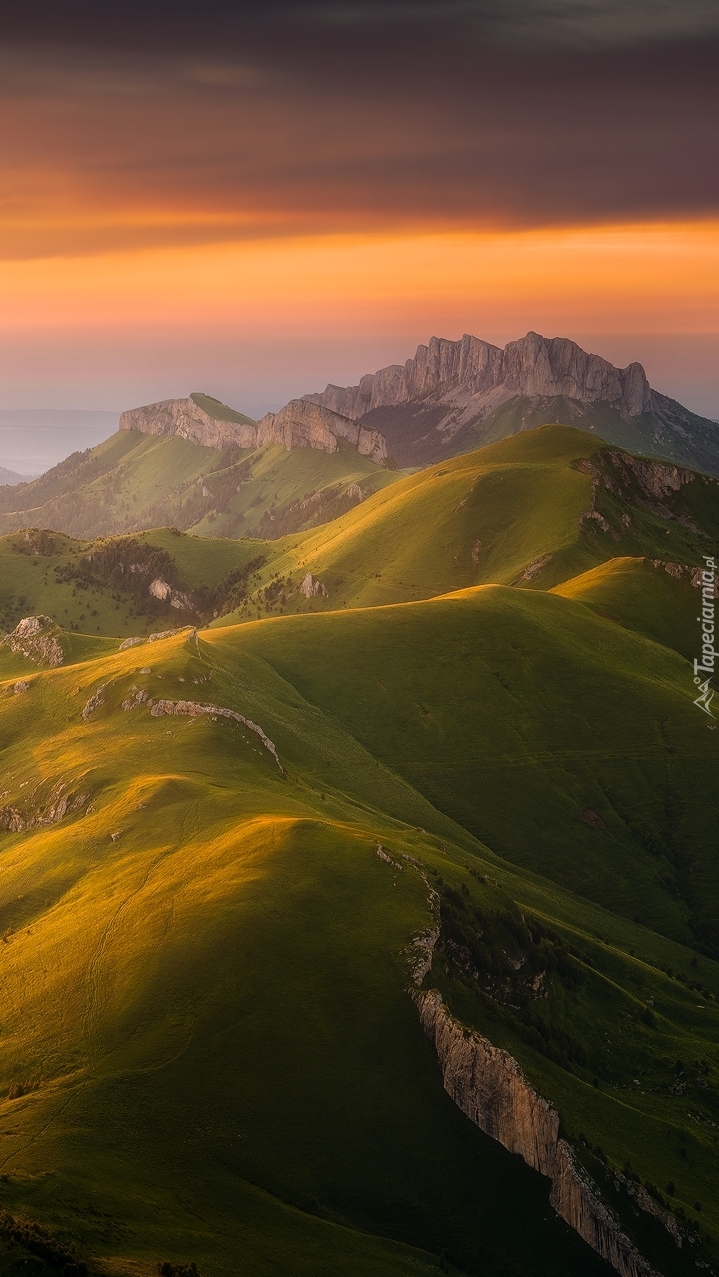 Edytor tapety: Zachód słońca nad górami i wzgórzami