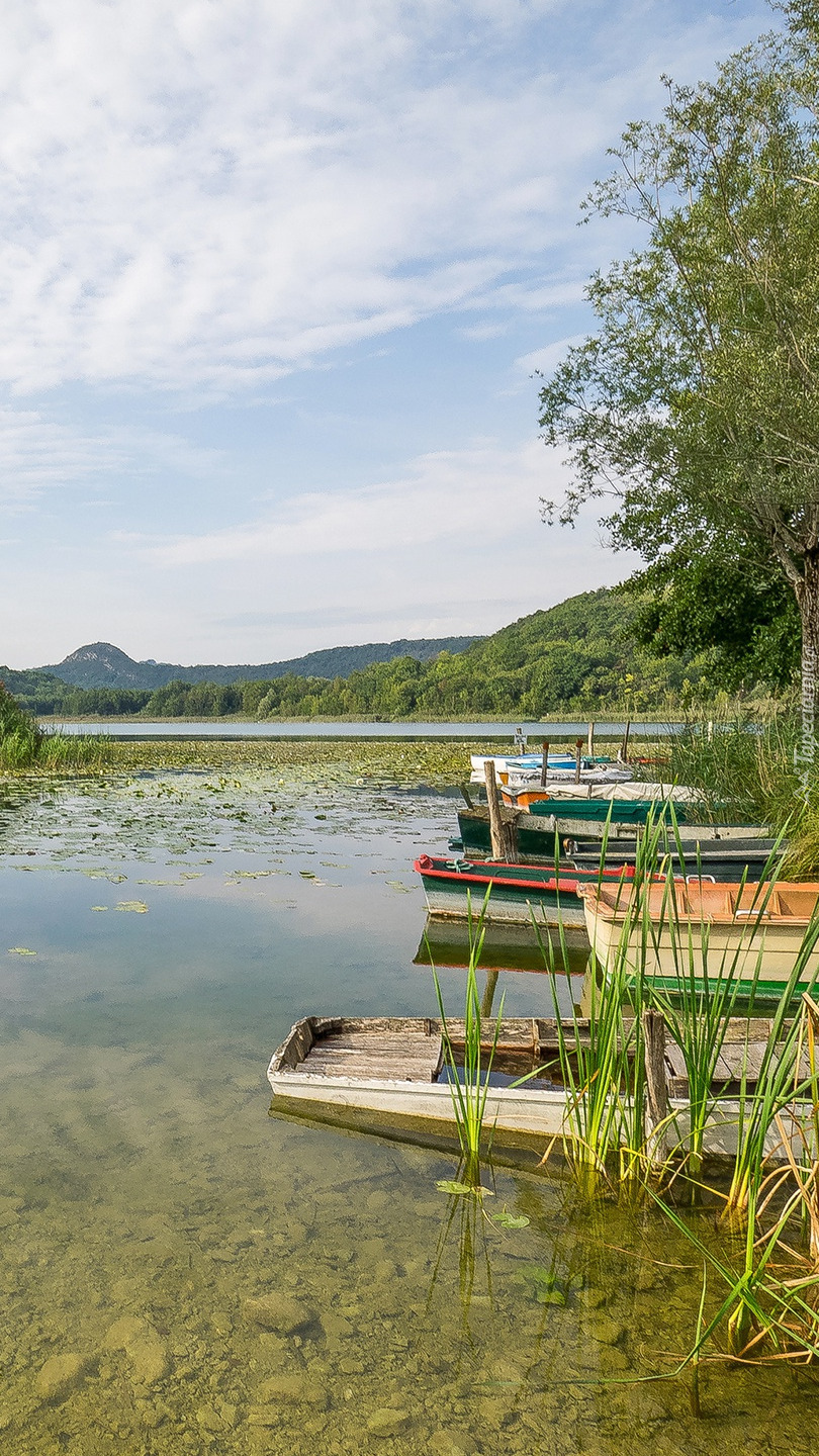 Edytor tapety: Łodzie pod drzewem na brzegu jeziora