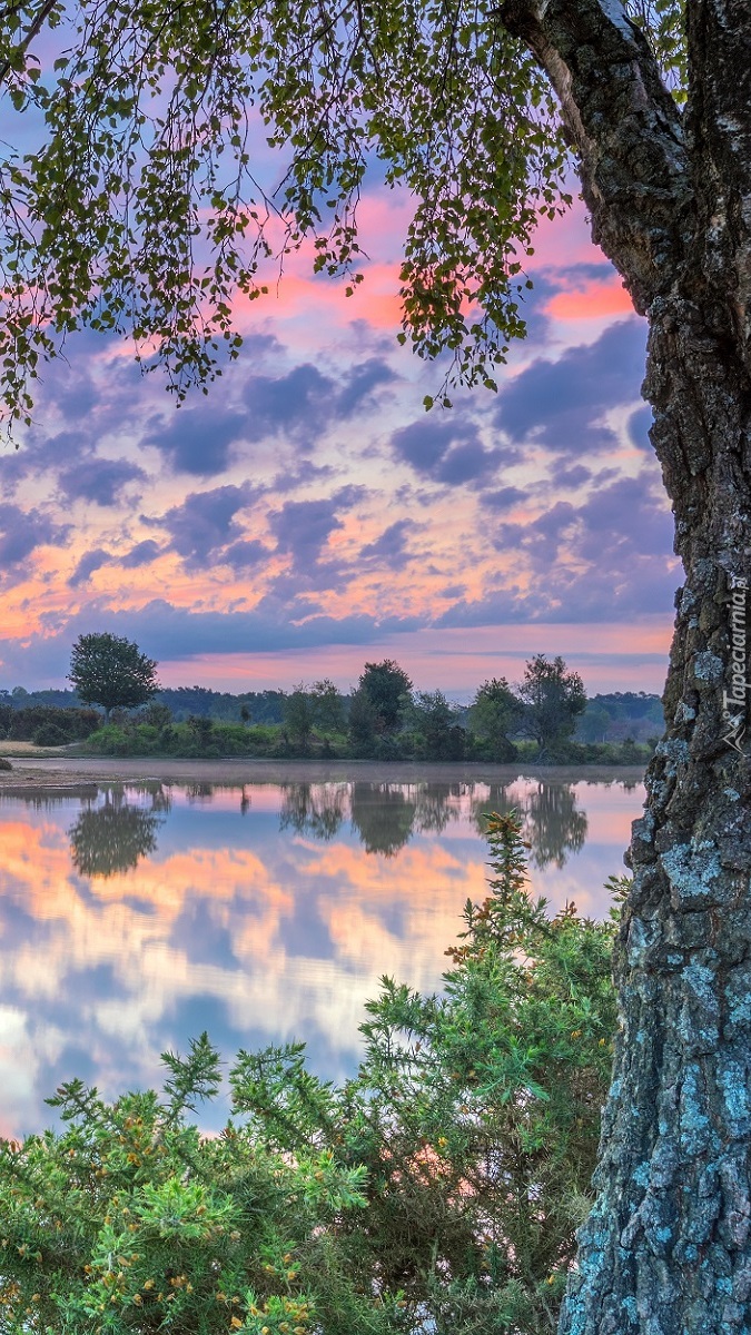 Edytor tapety: Brzoza i krzewy nad rzeką