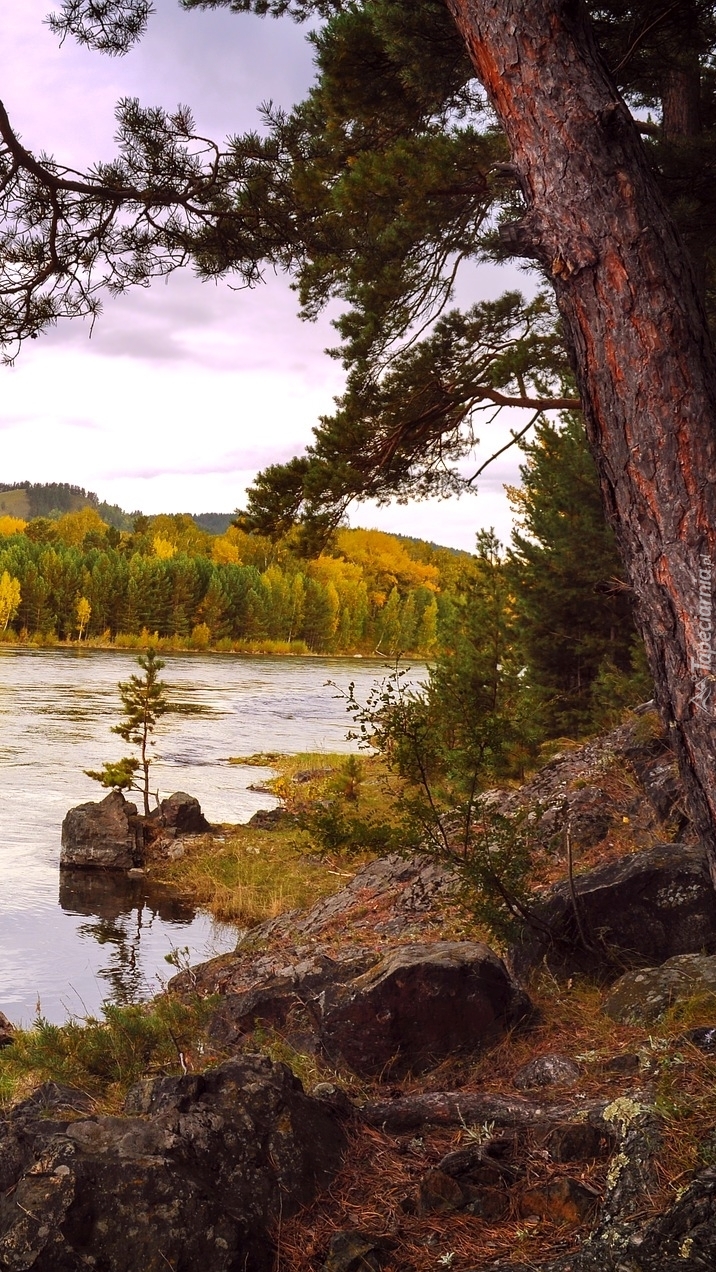 Edytor tapety: Kamienie obok drzewa na brzegu jeziora