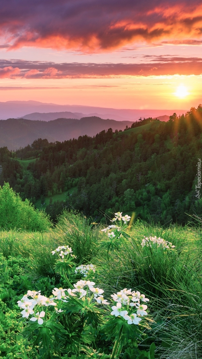 Edytor tapety: Wschód słońca nad górami i lasami