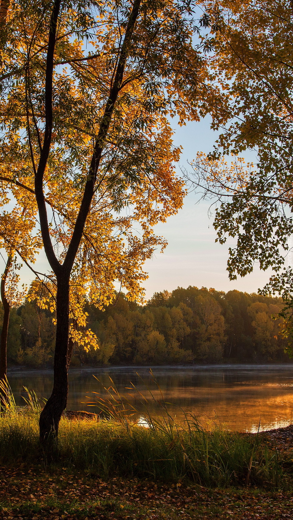Edytor tapety: Rozświetlone drzewa nad jeziorem