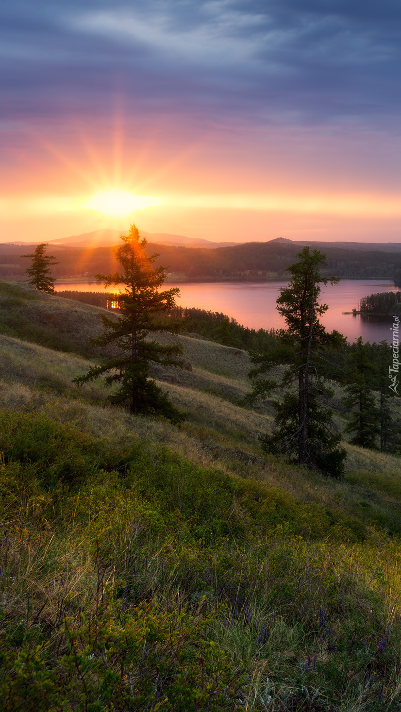 Edytor tapety: Promienie słońca nad rzeką i wzgórzem