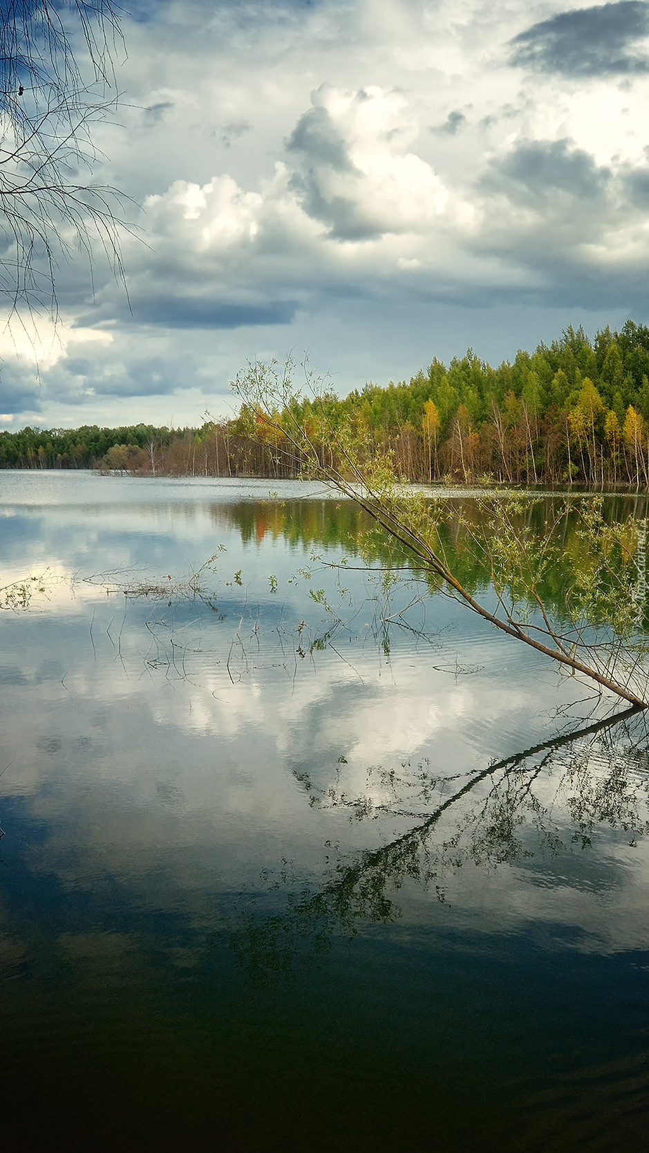 Edytor tapety: Odbicie chmur i drzew w jeziorze