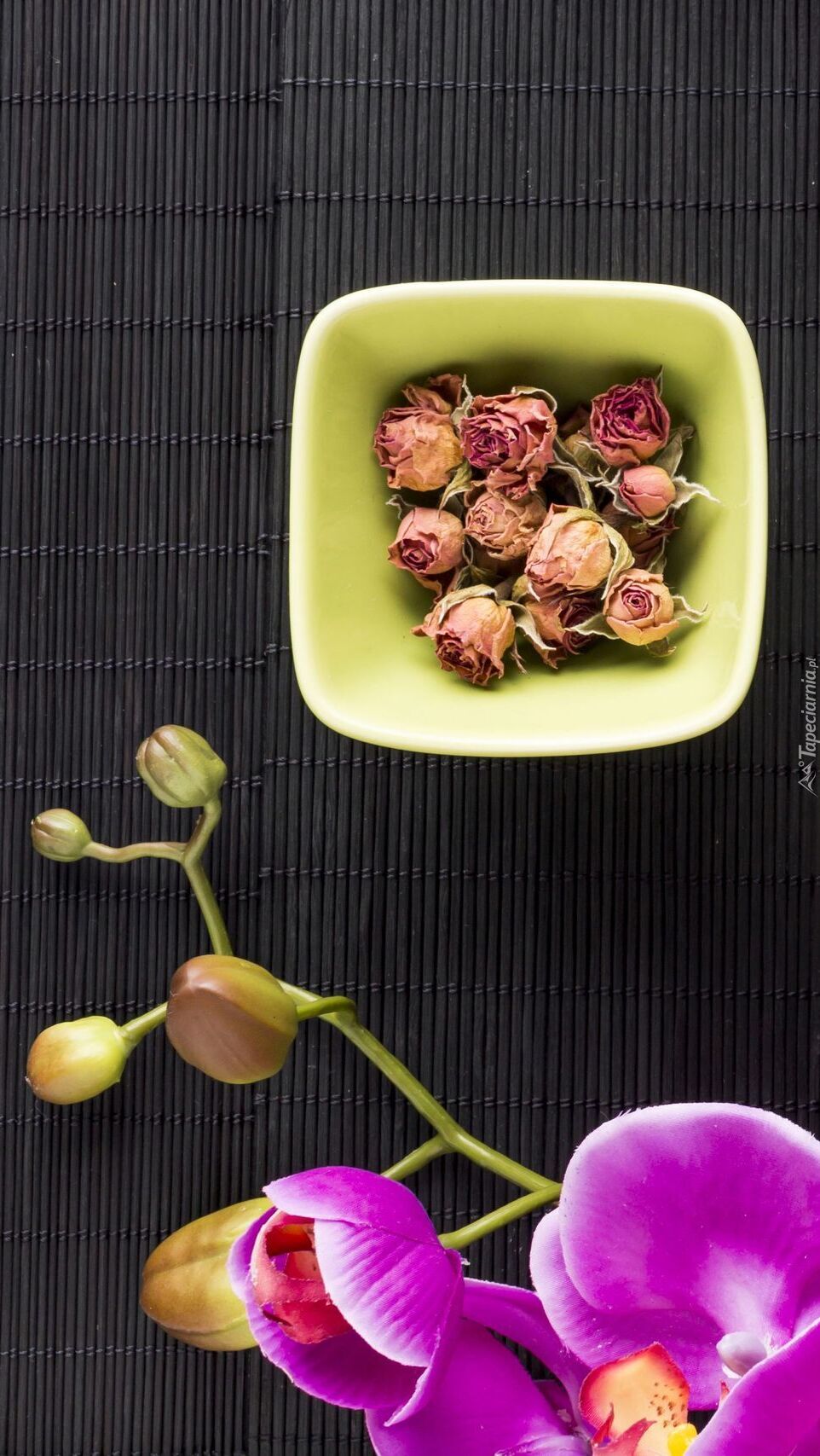 Edytor tapety: Uschnięte różyczki w miseczce obok storczyków