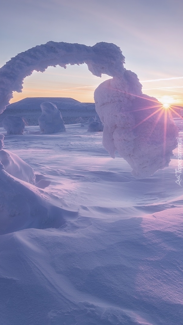 Edytor tapety: Promienie słońca na ośnieżonym drzewie