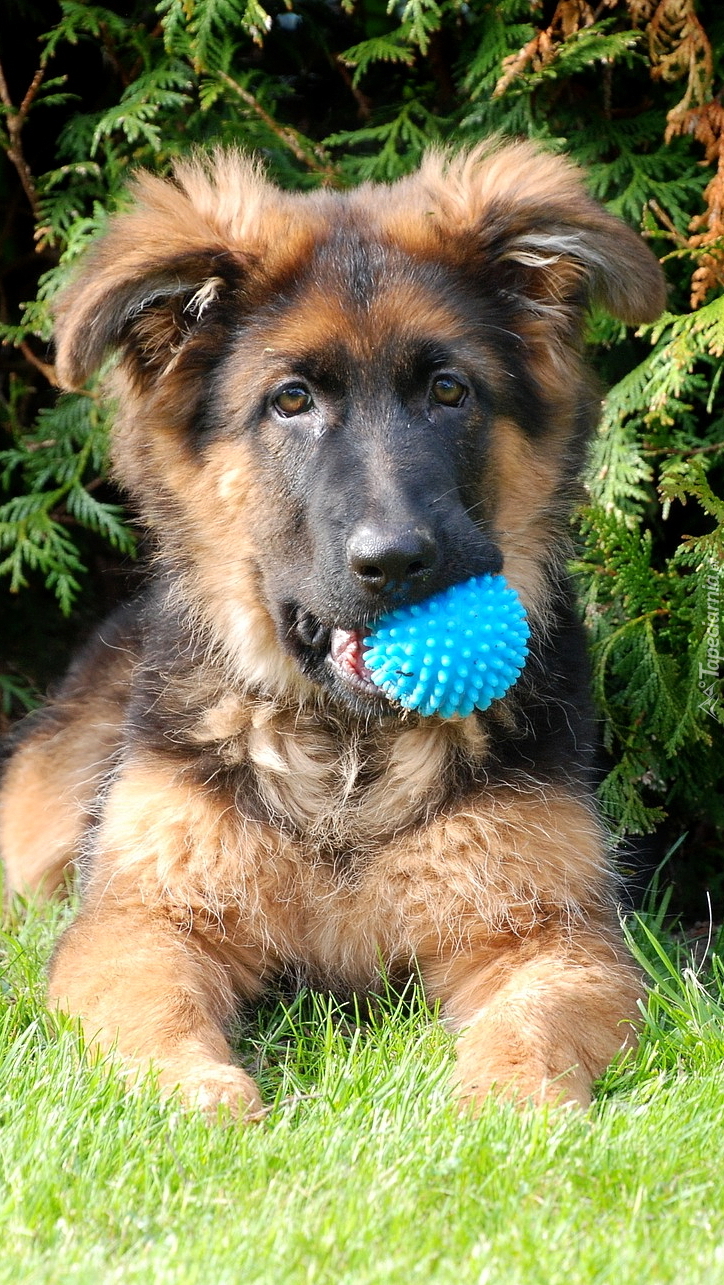 Edytor tapety: Szczeniak owczarka z piłeczką w pysku