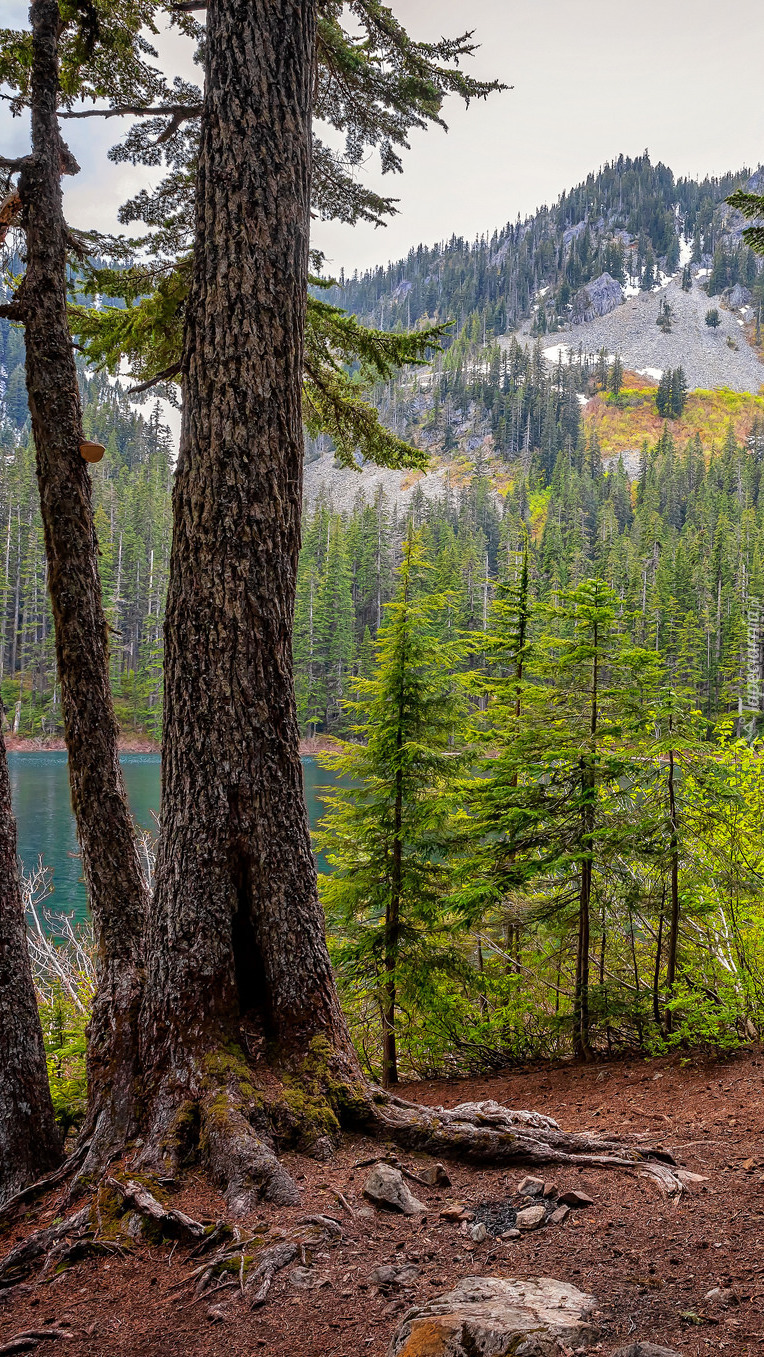 Edytor tapety: Drzewa i góry nad jeziorem