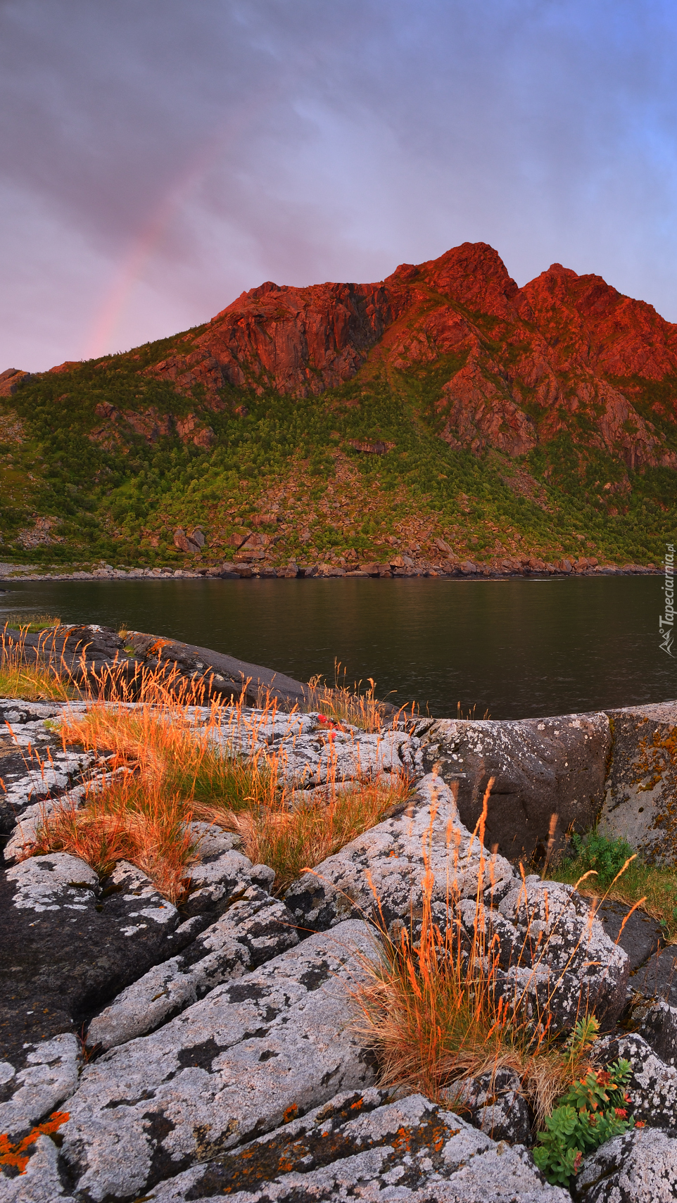 Edytor tapety: Rośliny na skałach wokół jeziora