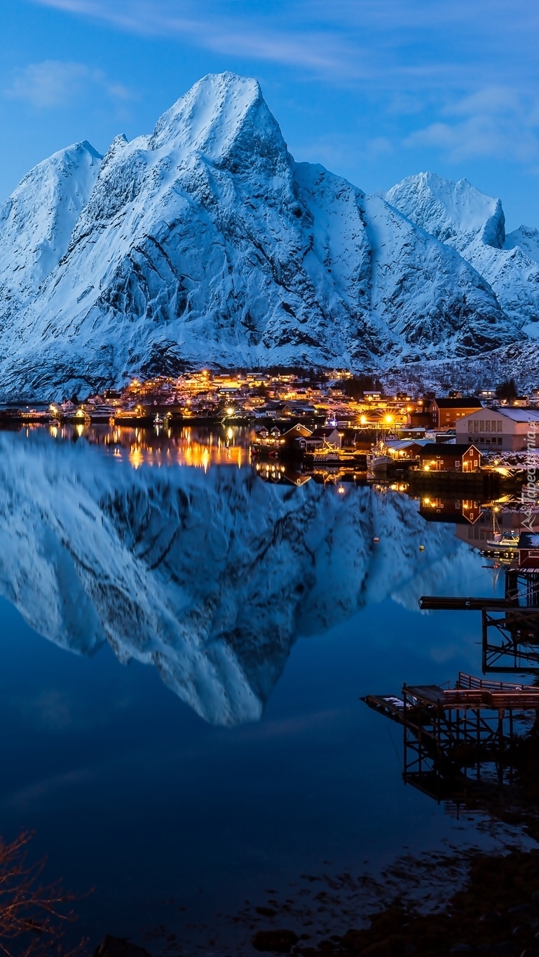 Edytor tapety: Oświetlona wieś Reine w Norwegii
