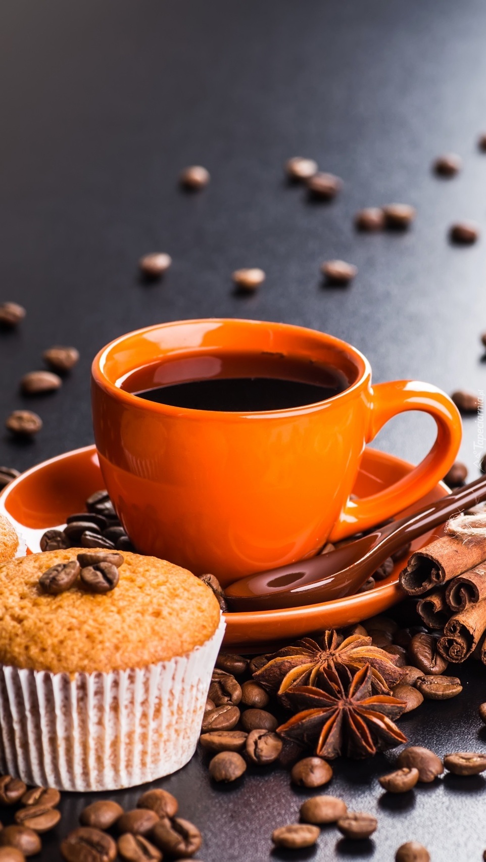 Edytor tapety: Babeczka obok filiżanki z kawą