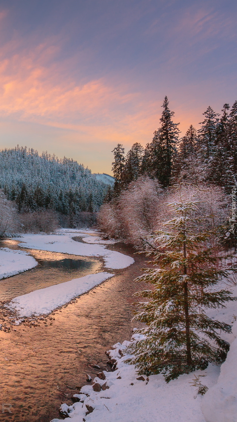 Edytor tapety: Rzeka pośród ośnieżonego lasu