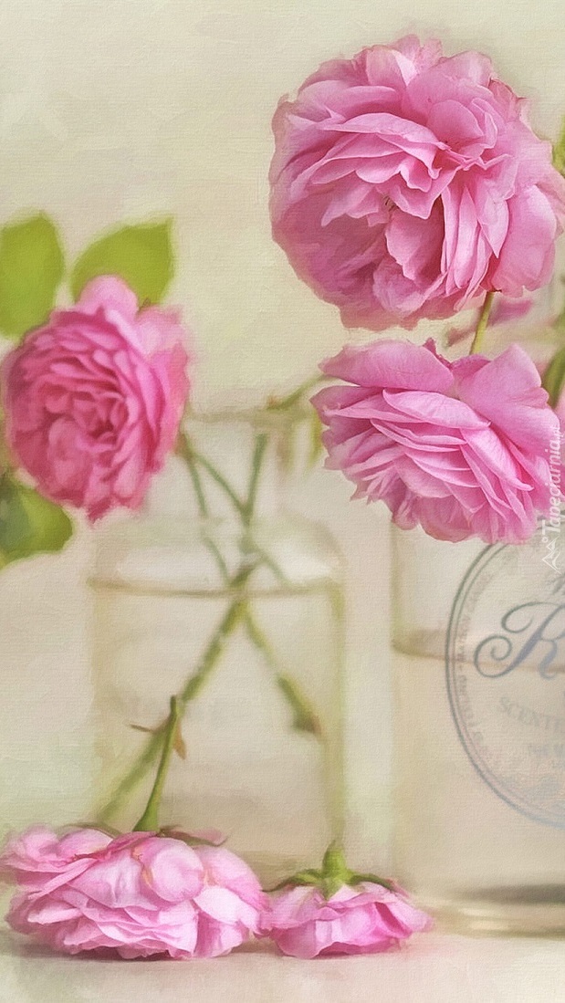 Edytor tapety: Różowe róże w szklanych naczyniach