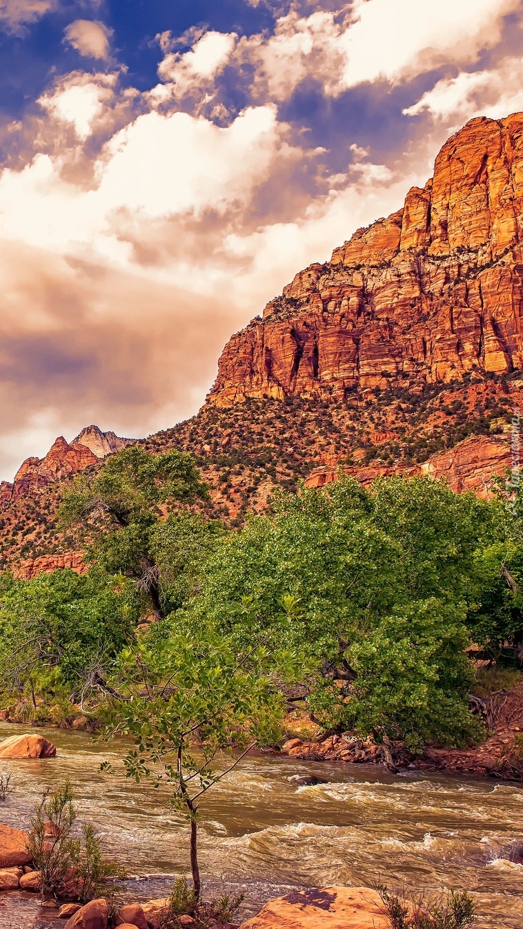 Edytor tapety: Drzewo nad rzeką na tle gór