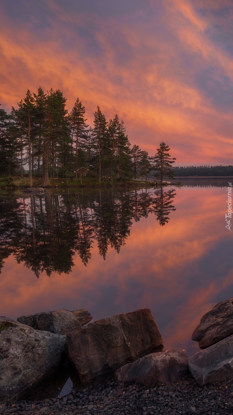 Edytor tapety: Kamienie i drzewa nad jeziorem
