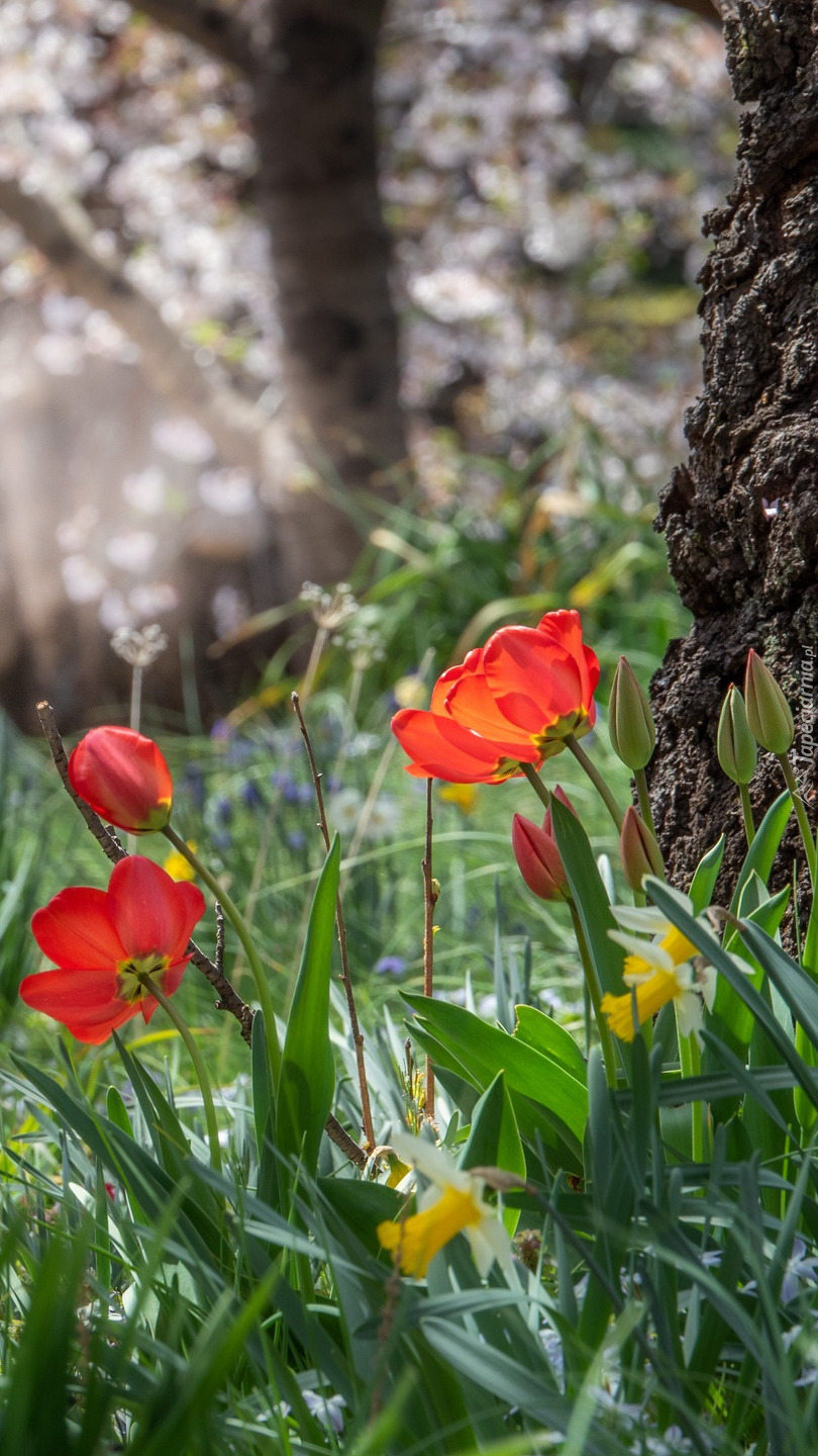 Edytor tapety: Tulipany i narcyzy pod drzewem