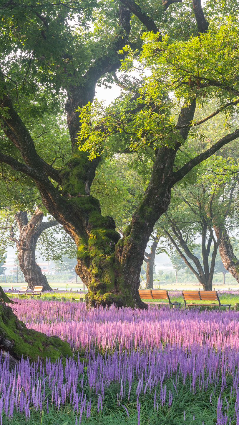 Edytor tapety: Ławki pod rozłożystym drzewem w parku