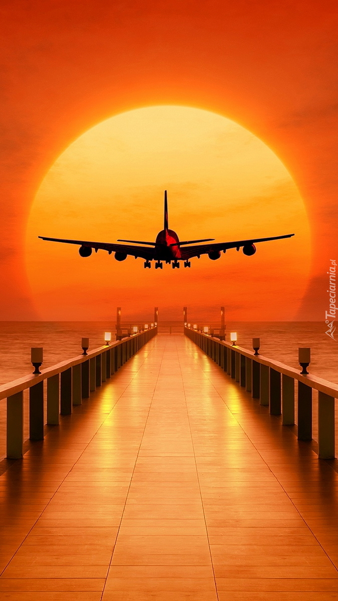 Edytor tapety: Samolot nad molem w zachodzącym słońcu