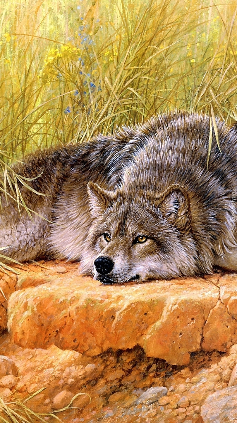 Edytor tapety: Leżący wilk na skarpie