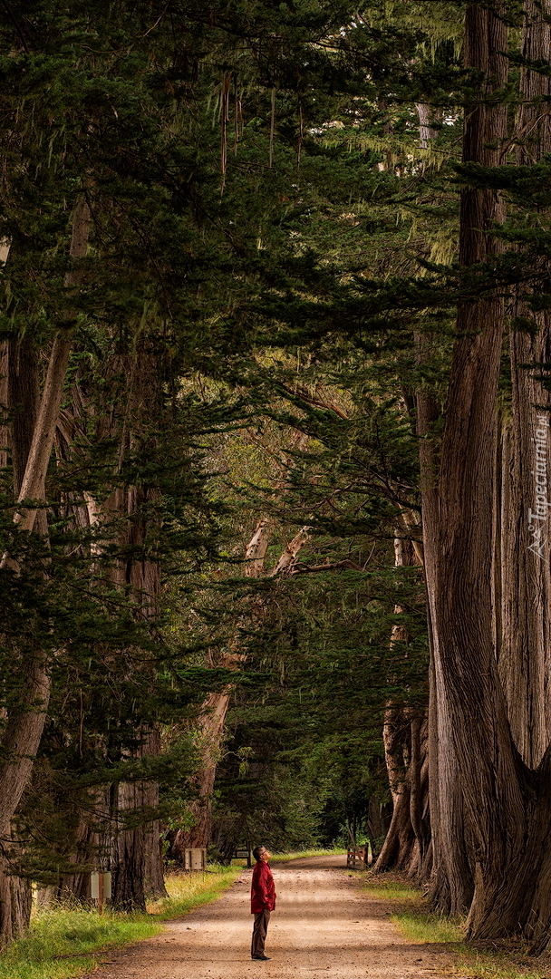 Edytor tapety: Człowiek w alei wysokich drzew