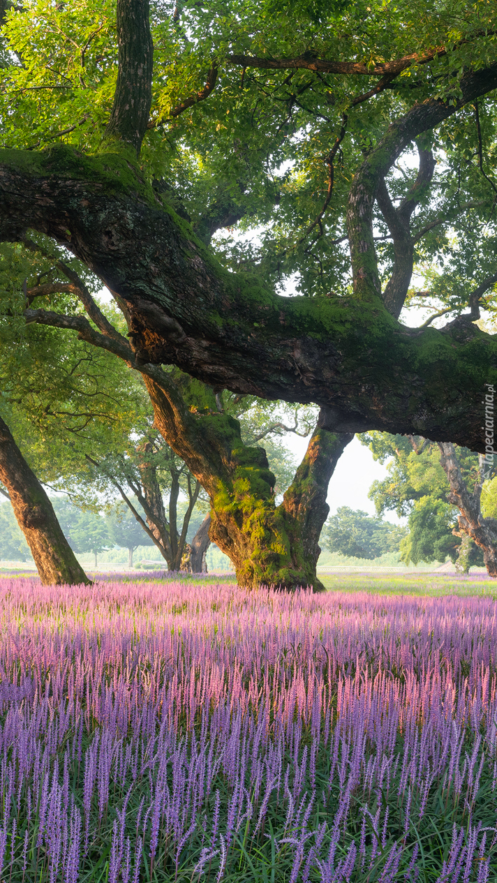 Edytor tapety: Fioletowe kwiaty wokół drzew