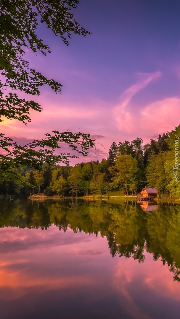 Edytor tapety: Domek pod lasem nad jeziorem