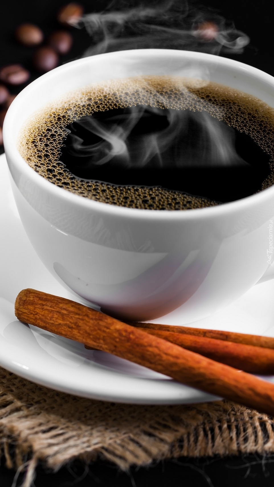 Edytor tapety: Cynamon przy filiżance z czarną kawą