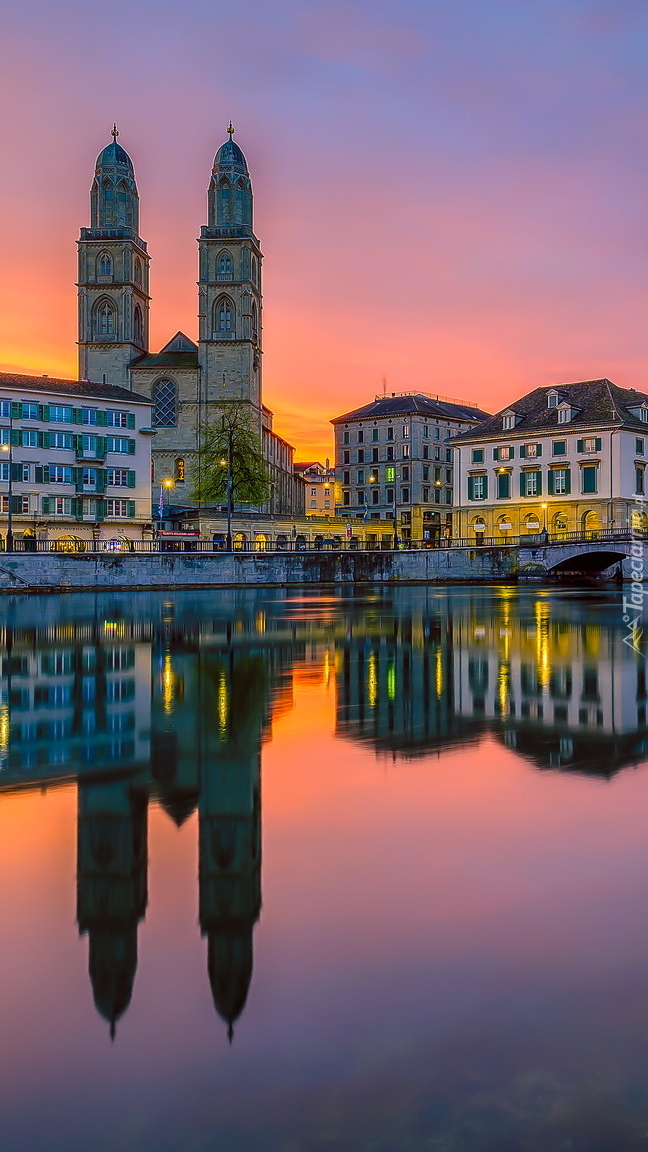 Edytor tapety: Kościół Grossmunster nad rzeką Limmat