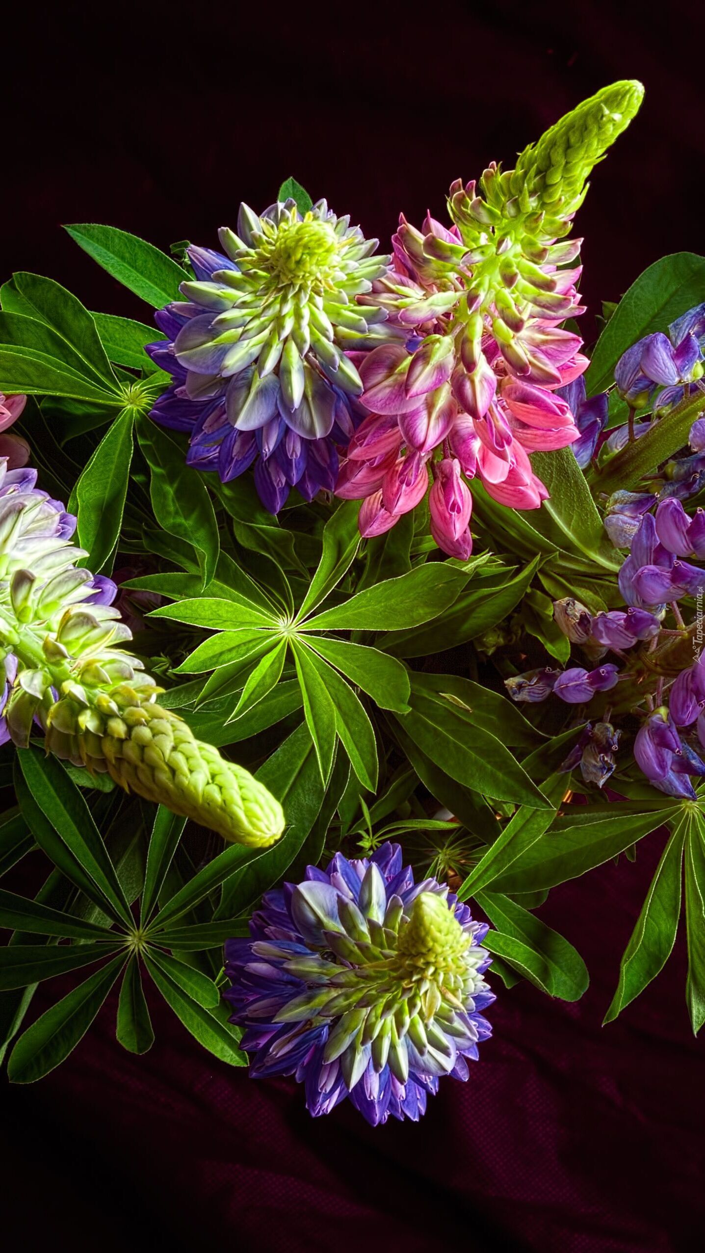 Edytor tapety: Kolorowe łubiny na ciemnym tle