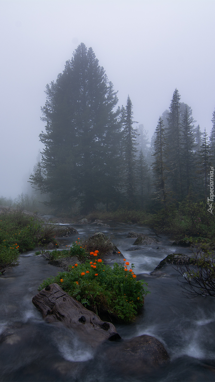 Edytor tapety: Pochmurny poranek nad rzeką w lesie