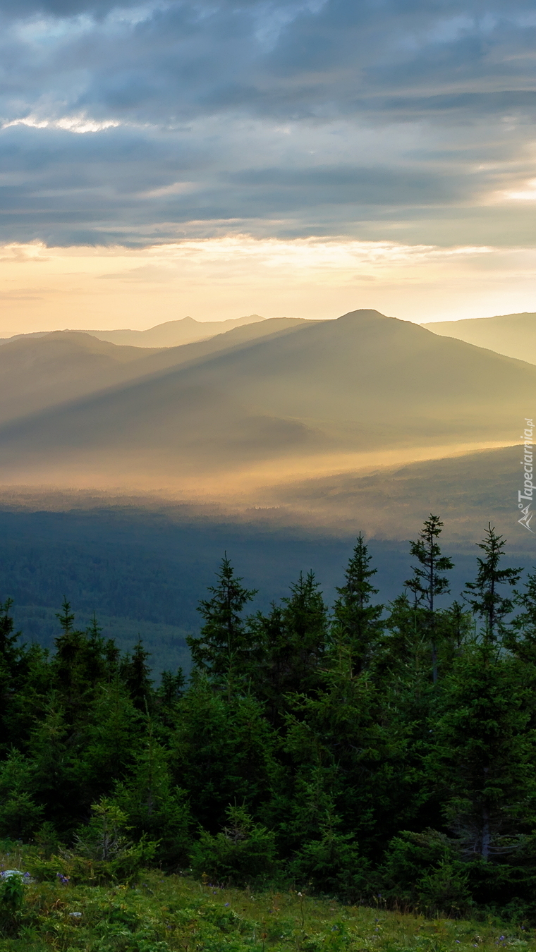 Edytor tapety: Góry i drzewa o wschodzie słońca