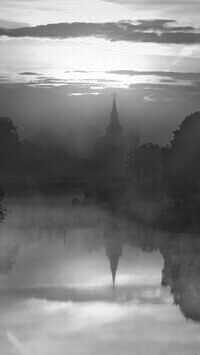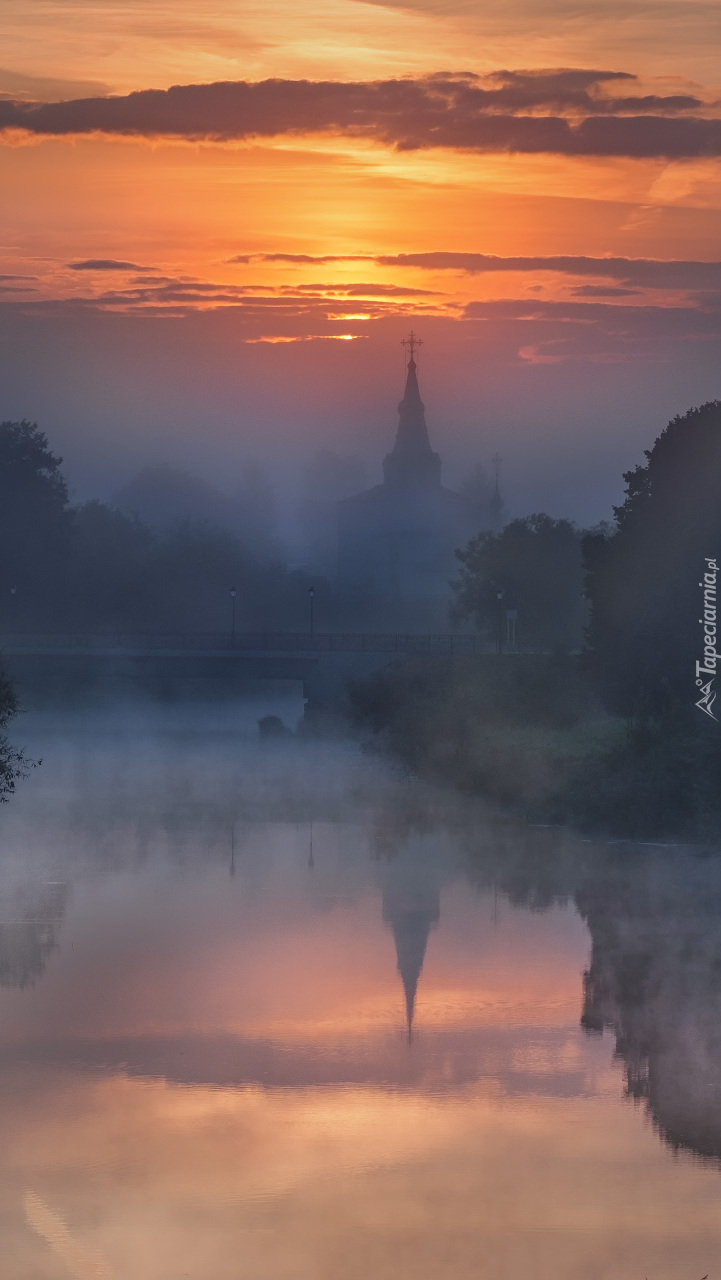 Edytor tapety: Cerkiew nad rzeką Kamienka we mgle